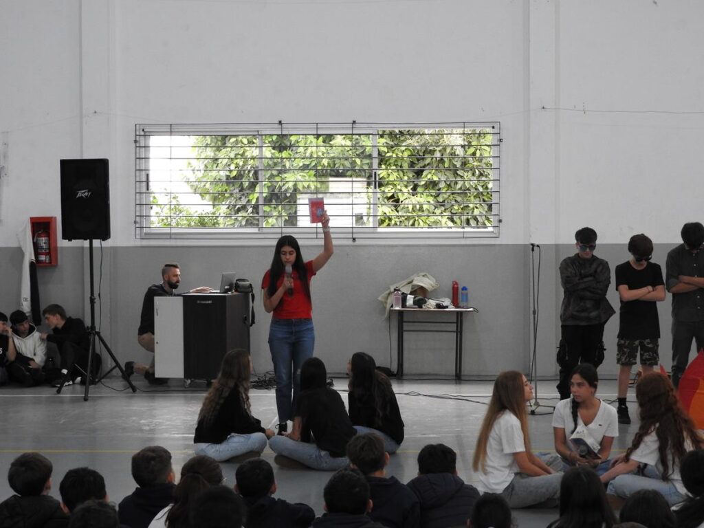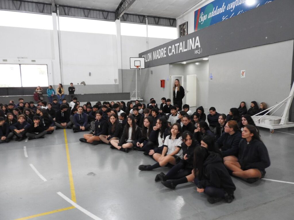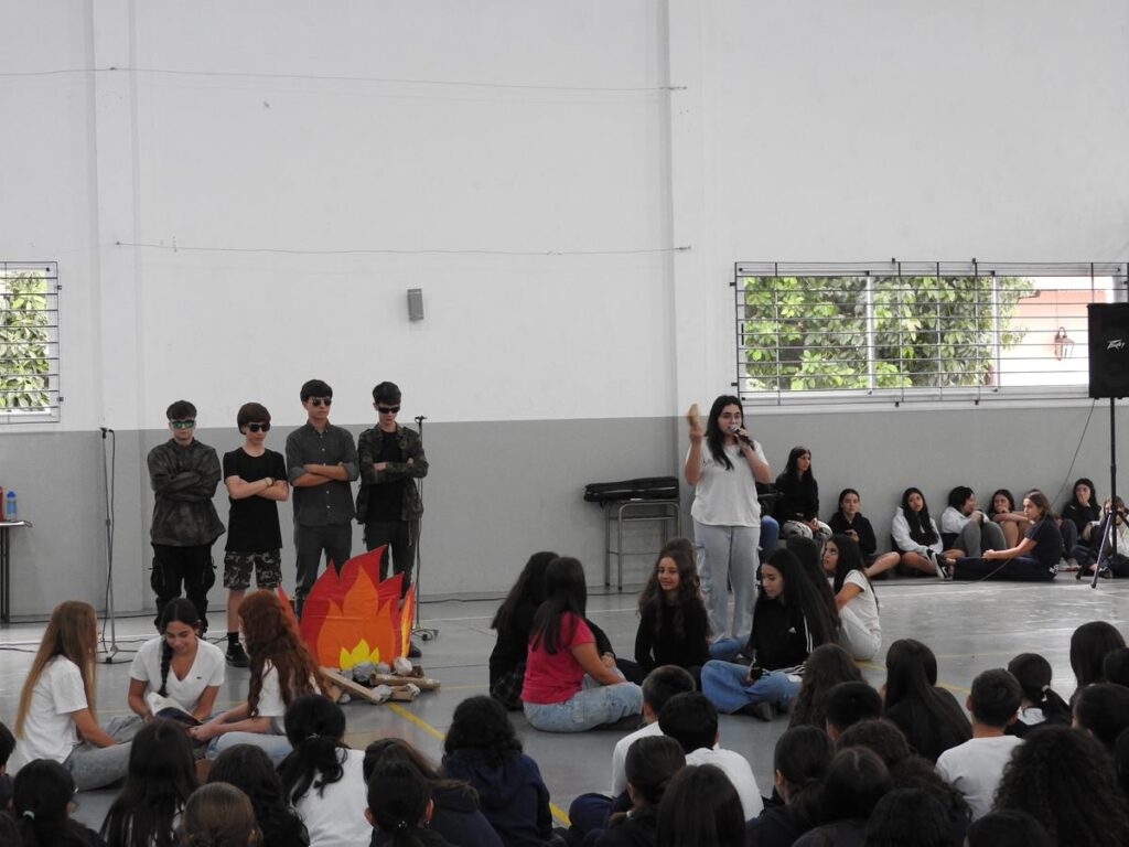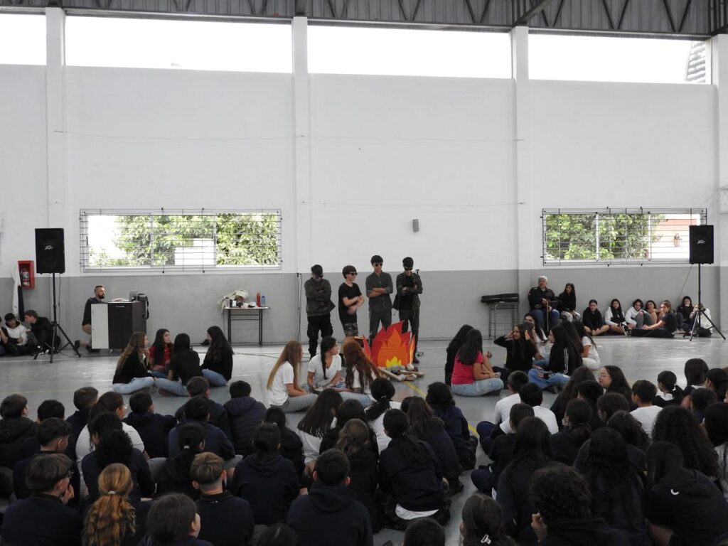 Alumnas y alumnos de 4to año B que teatralizaron ese momento.