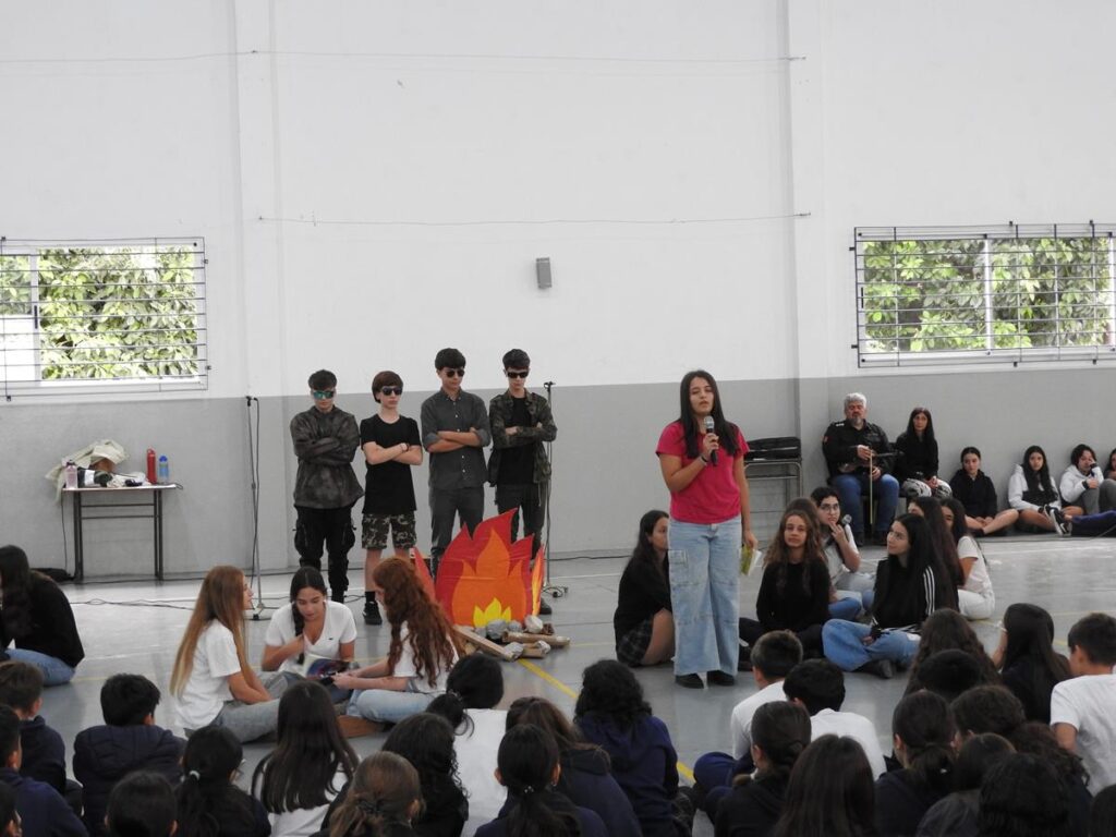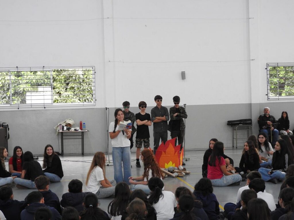 Estudiantes de 6to año, dirigidos por la Prof. Adriana Pacheco y acompañados por José Rajal, papá del Colegio, nos regalaron una canción que retrata la terrorífica escena.