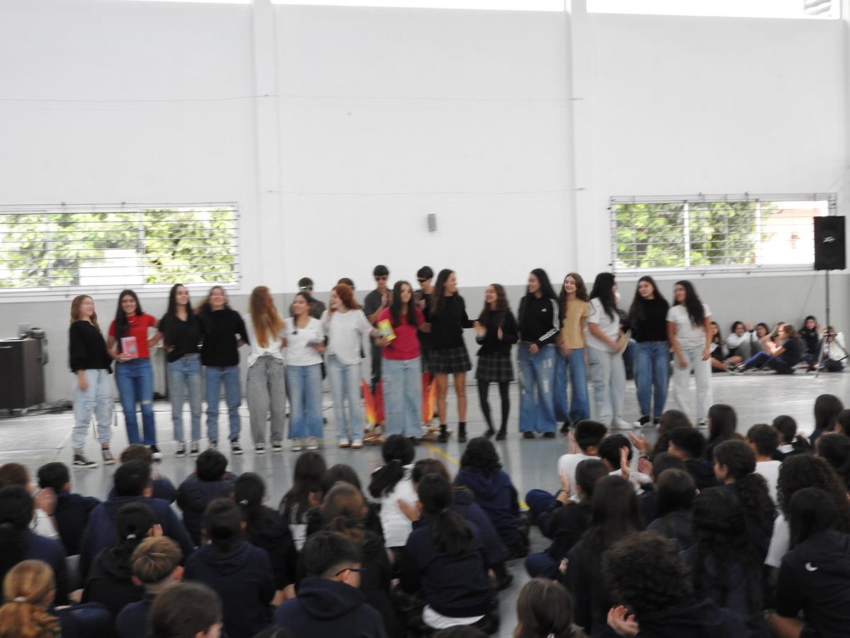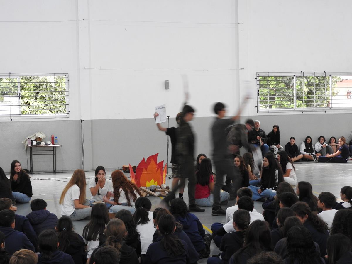 Alumnas y alumnos de 4to año B que teatralizaron ese momento.