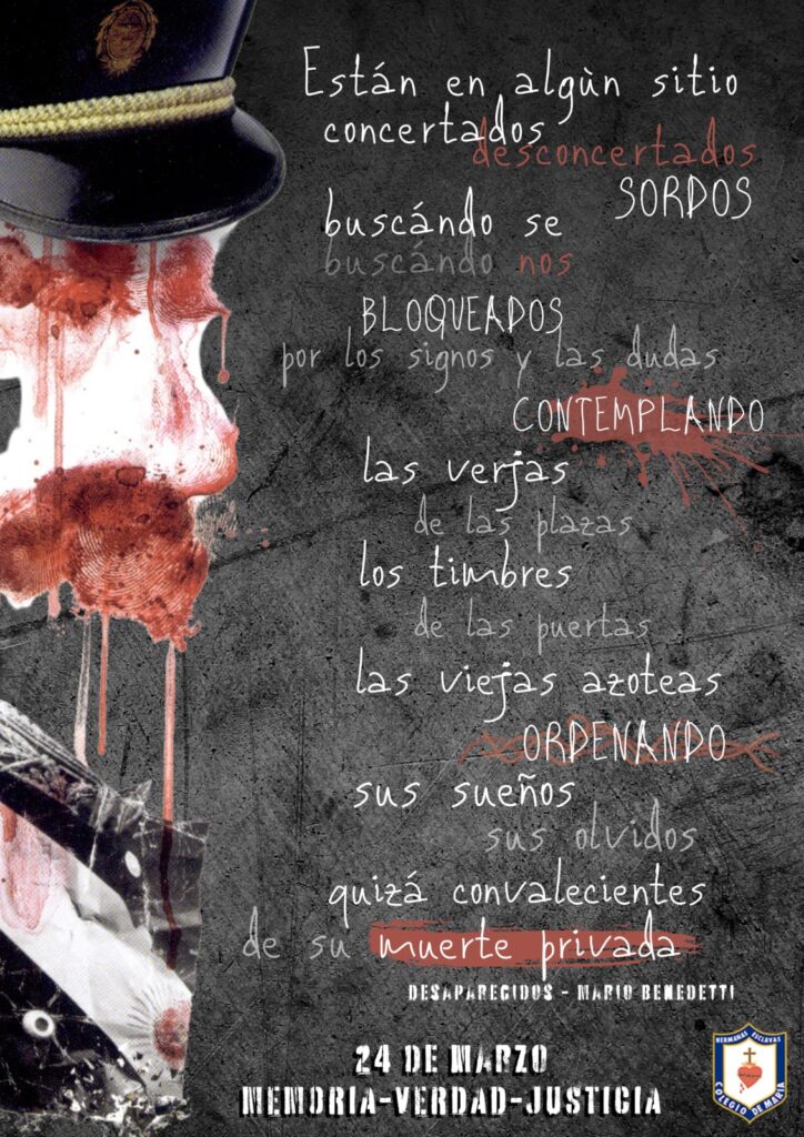Jornada de reflexión martes 25 de marzo de 2025 El Día Nacional de la Memoria por la Verdad y la Justicia es el día en el que se conmemora en Argentina a las víctimas de la última dictadura militar, autodenominada «Proceso de Reorganización Nacional», que usurpó el gobierno del Estado nacional argentino entre el 24 de marzo de 1976 y el 10 de diciembre de 1983. Este espacio nos invita a reflexionar y analizar críticamente nuestra historia reciente y comprender los alcances de las graves consecuencias económicas, sociales y políticas de la última dictadura militar, invitándonos a comprometernos activamente en la defensa de la vigencia de los derechos y las garantías establecidos por la Constitución Nacional.