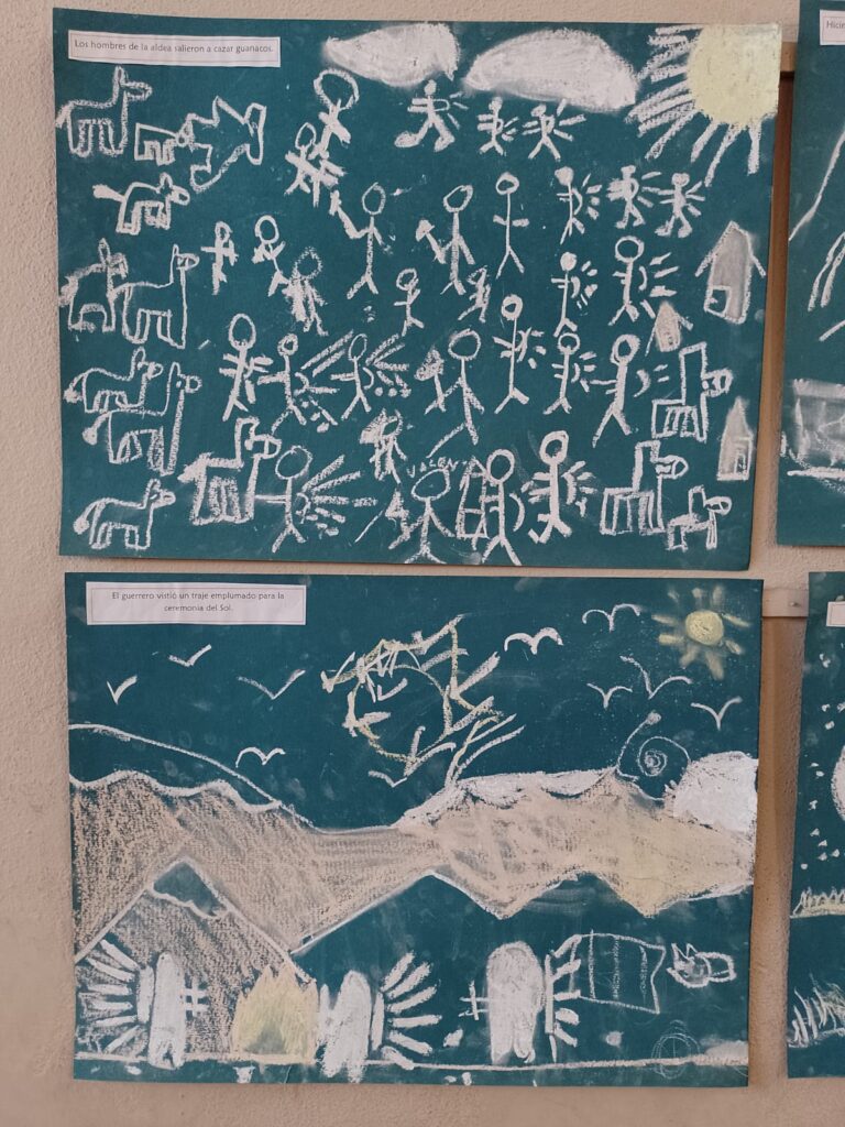Se preparó, para esa ocasión, un compilado con fotografías obtenidas en la salida educativa al Cerro Colorado pudiendo compartirlas de esta manera con los alumnos y familiares presentes. En un tercer momento, por grupos, se realizaron pinturas rupestres. Podían utilizar las formas observadas en la salida educativa que realizamos al Cerro Colorado. Utilizamos cartulinas y tizas mojadas como una técnica plástica. A partir de una frase, debían dibujar lo allí expresado. Los visitantes también debían participar.