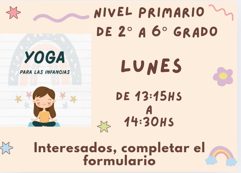 LUNES | RONDA DE LA CALMA Sala de 5 años Almuerzo: 12:30 a 13:00 Hs Clase: 13.00 a 14.00 hs Sala de Plástica Primario | ARTE 4º, 5º y 6º grado 13.00 a 14.00 hs Sala de Jardín | YOGA 2º a 6º Grado 13.00 a 14.30hs Galería de Jardín | RONDA DE LA CALMA 1º y 2º grado 13.00 a 14.00 hs Sala de Plástica Primario | ||