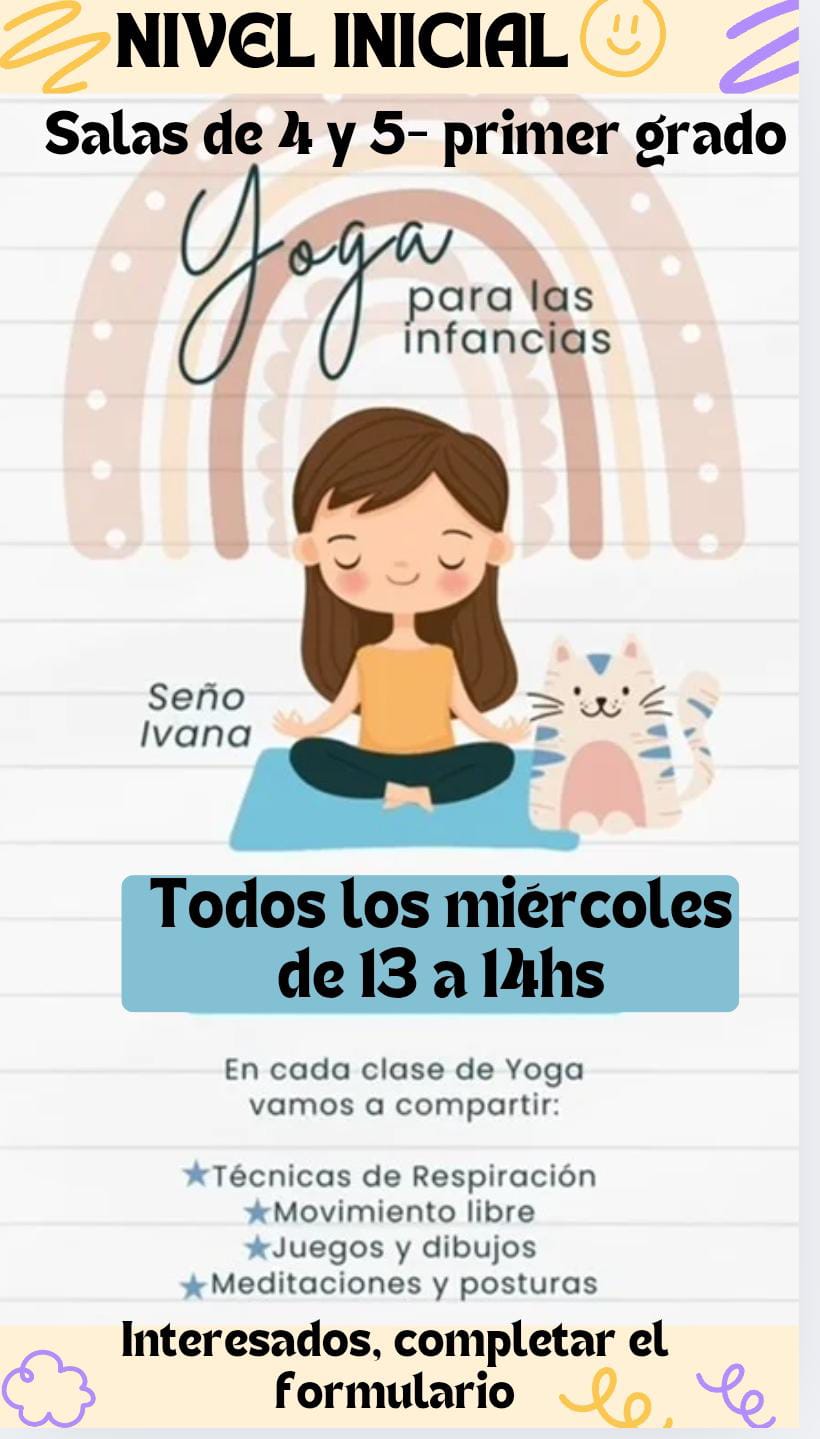 MIERCOLES | YOGA Sala de 4 y 5 años Almuerzo: 12:30 a 13:00 Hs Clase:13.00 a 14.00 hs Sala de Plástica Primario | YOGA 1º Grado 13.00 a 14.00 hs Sala de Plástica Primario | ||||