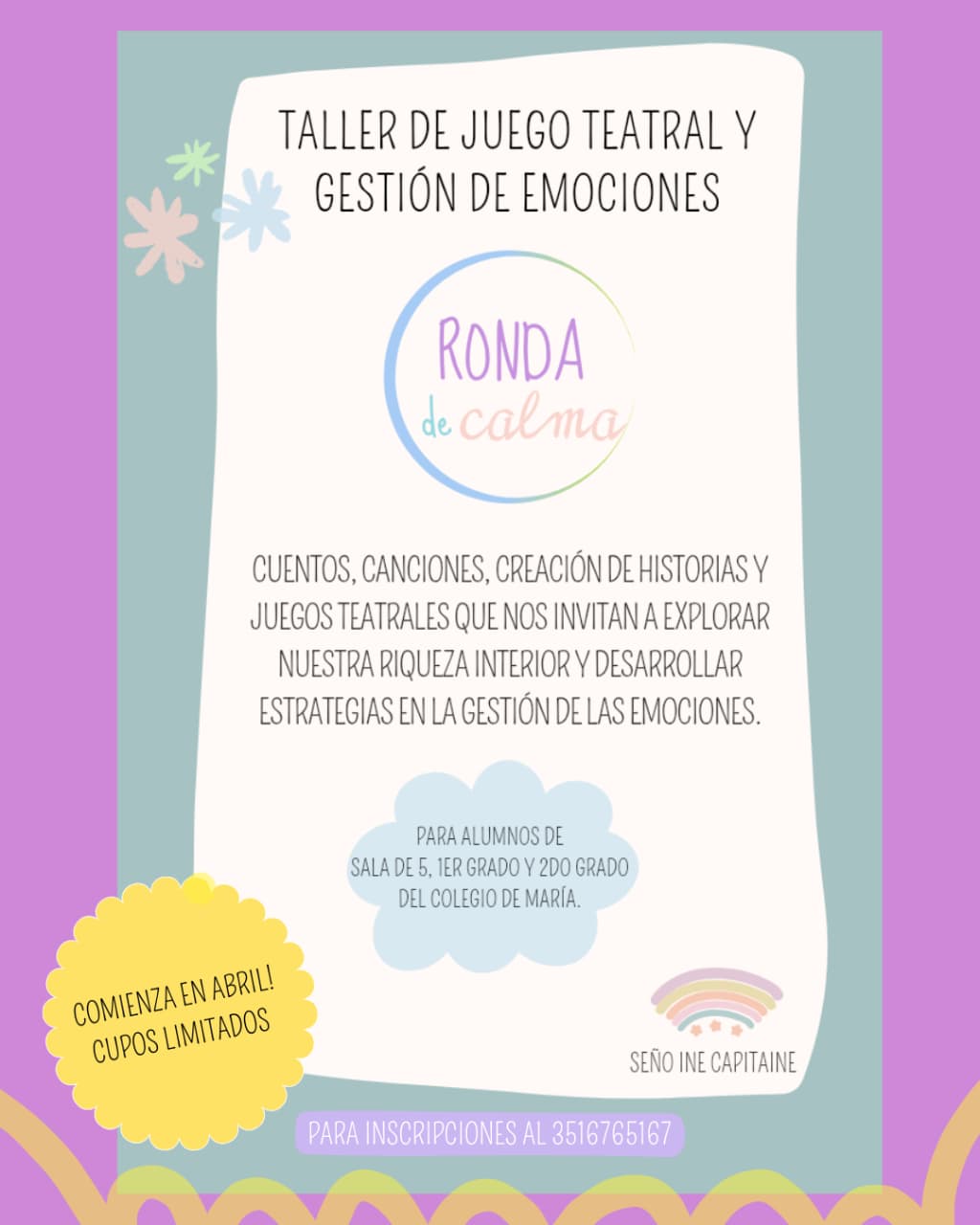 ARTE Prof Paula Dapuez 351-3520963 | RONDA DE LA CALMA TEATRO Prof Inés Capitaine 351-6765167 | YOGA Prof. Ivana Ortiz 351-6091906 | ||||
