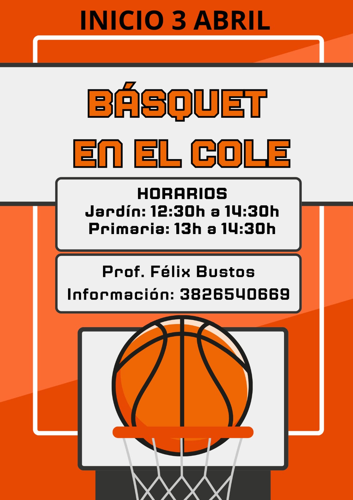 JUEVES | BASQUET Sala de 4 y 5 años Almuerzo 12:30 a 13:00 Hs Clase: 13.00 a 14.30 hs PATIO ROJO | Taller de Teatro “El RE-CREO” 3º a 6º Grado 13.00 a 14.15 hs Sala de Plástica Primario | HOCKEY 1º a 6º Grado 13:00 a 14:30 Hs SUM | BASQUET 1º a 6º Grado 13.00 a 14.30 hs PATIO ROJO | ||