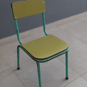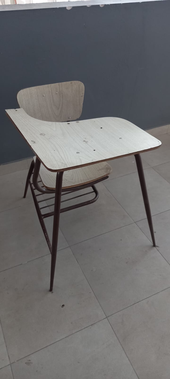 Banco de clases individual, tipo universitario. Estructura metálica con madera en asiento, respaldo y mesa de trabajo. Usados. En buenas condiciones. Se venden por unidad