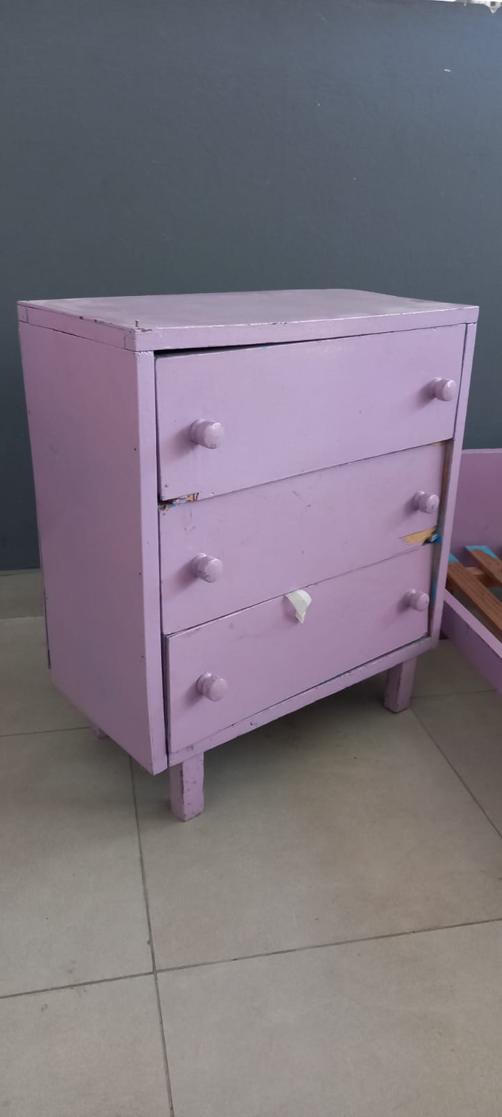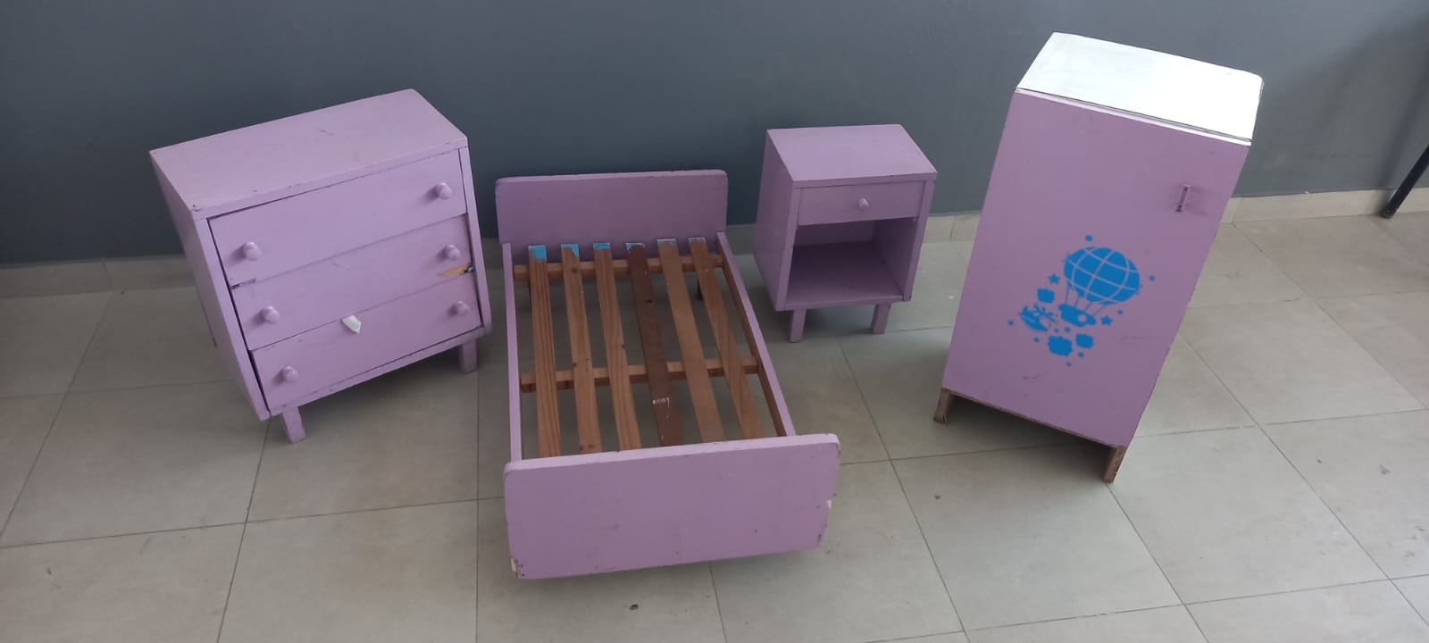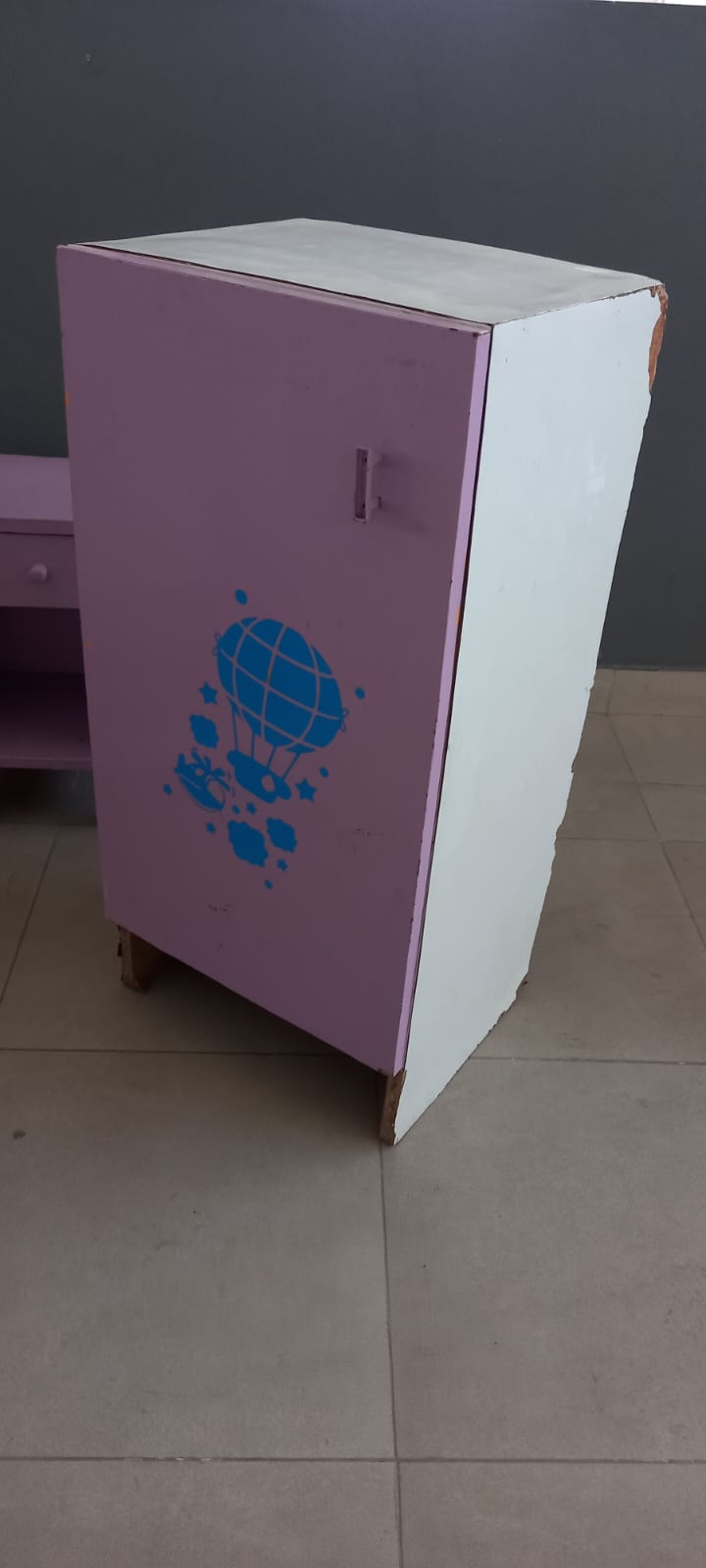 Juego de dormitorio infantil, que consta de cama, mesita, cajonera y mueble con puerta y estantes. Todos de madera con detalles y a reparar en partes. No se vende por partes.