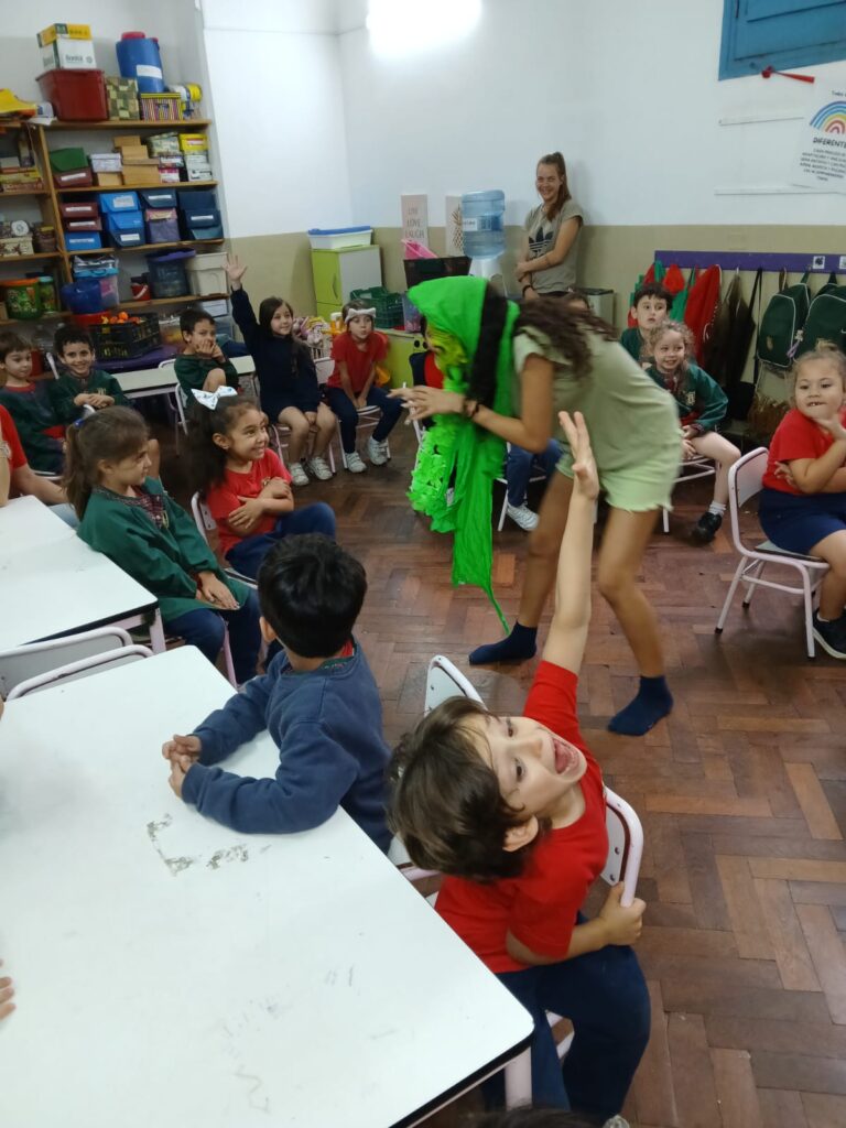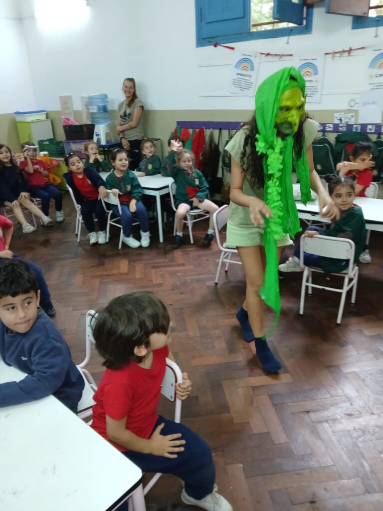 Los estudiantes de 3er año del grupo SENIOR del Colegio, junto a la Prof. Daniela Gagliardo, asistieron a las salas de 3, 4 y 5 años y compartieron sus cuentos con los más pequeños de la Institución. Fue una hermosa experiencia de intercambio de idioma y actuación donde los niños y las niñas experimentaron la narración y actuación de cuentos cortos en una lengua extranjera. Fue un momento mágico donde príncipes y princesas, animales del bosque y hadas, llenaron las salas de color y emoción.